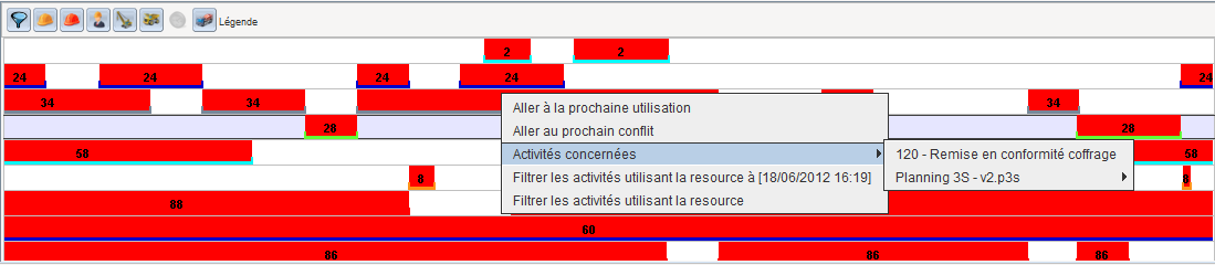 Ainsi, si une ressource est utilisée en même temps dans 2 projets différents, ils apparaitront dans le panneau “Statistiques” comme conflictuels. Un clic droit sur ce conflit permet, dans le menu “Activités concernées”, de voir que cette ressource est utilisée dans l'autre projet.