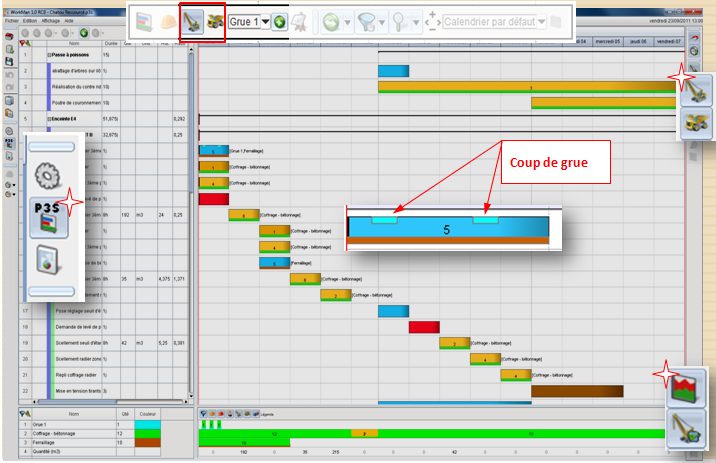 • Faire un cliquer-glisser avec le bouton droit de la souris sur une tâche dans la vue Gantt. Il faut au préalable avoir sélectionné le mode “Matériel” ou “Grues” dans la barre flottante, et choisi la ressource que l'on souhaite affecter via la liste déroulante