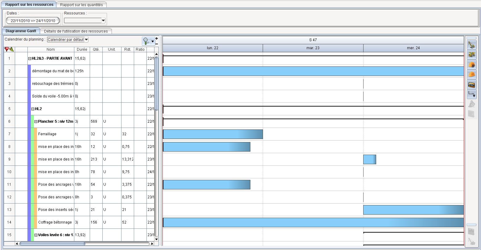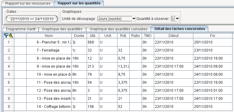 L'onglet “Détail des tâches concernées” permet de repérer les tâches utilisant une certaine ressource.
