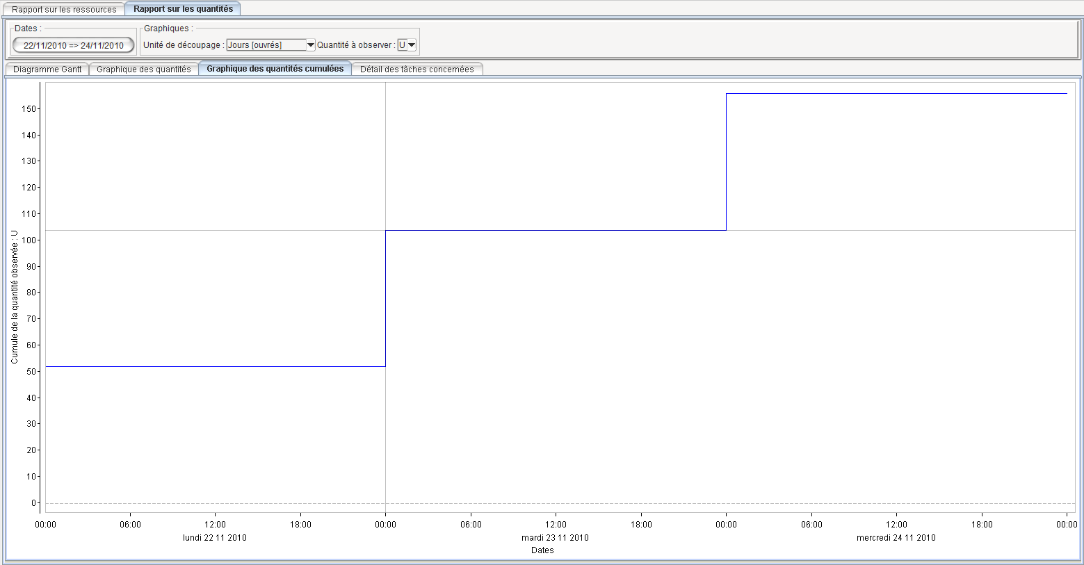 L'onglet “Graphique des quantités cumulées” montre le total de matériel utilisé à une certaine date.